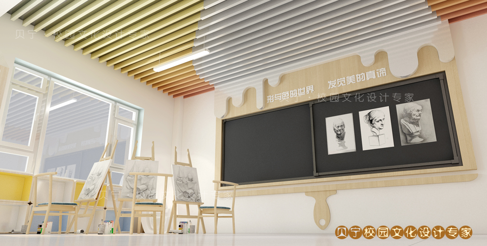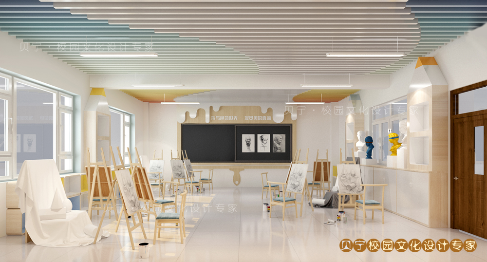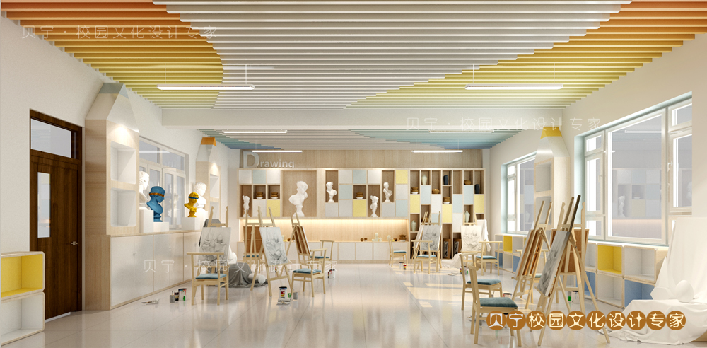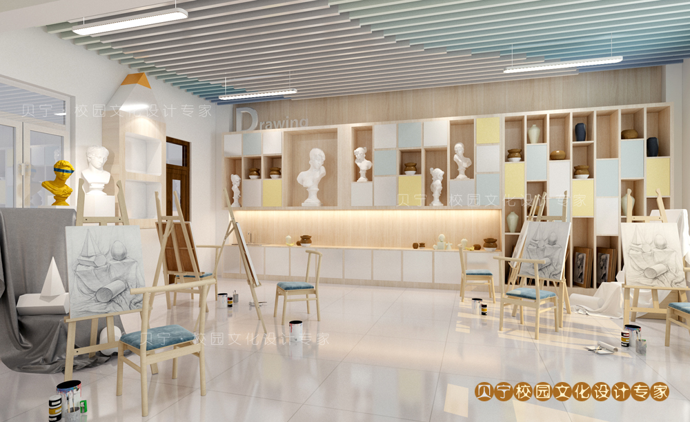 色彩氛围+艺术环境+合理的收纳陈列,是美术教室的灵魂:来到这里勾起的不只是想涂鸦一笔的兴趣,而是乐于陶醉其中的梦想。
