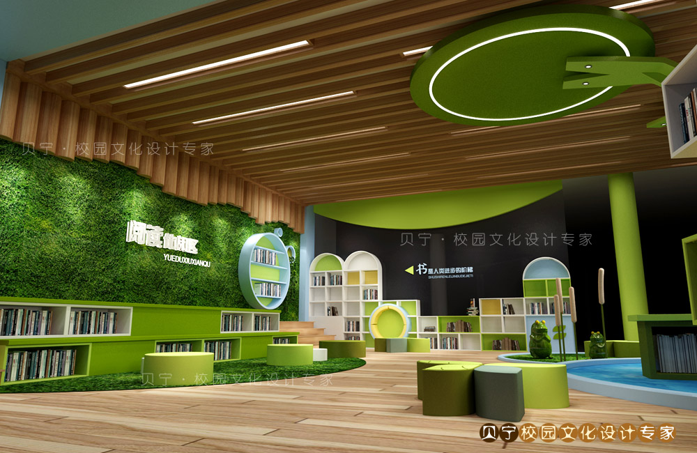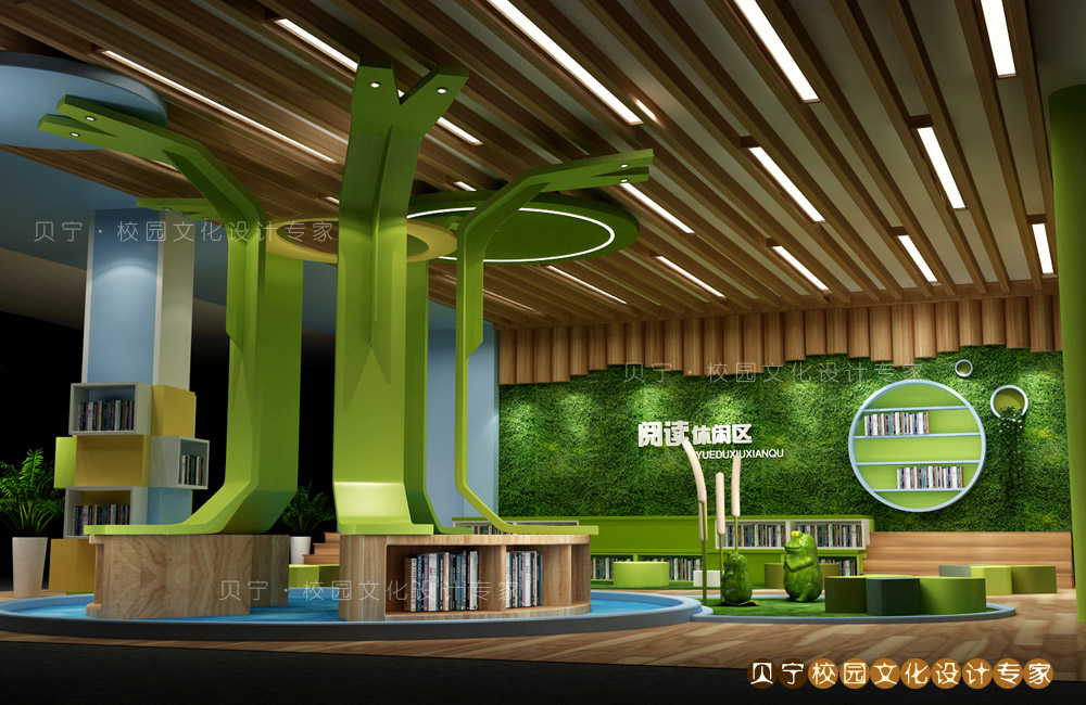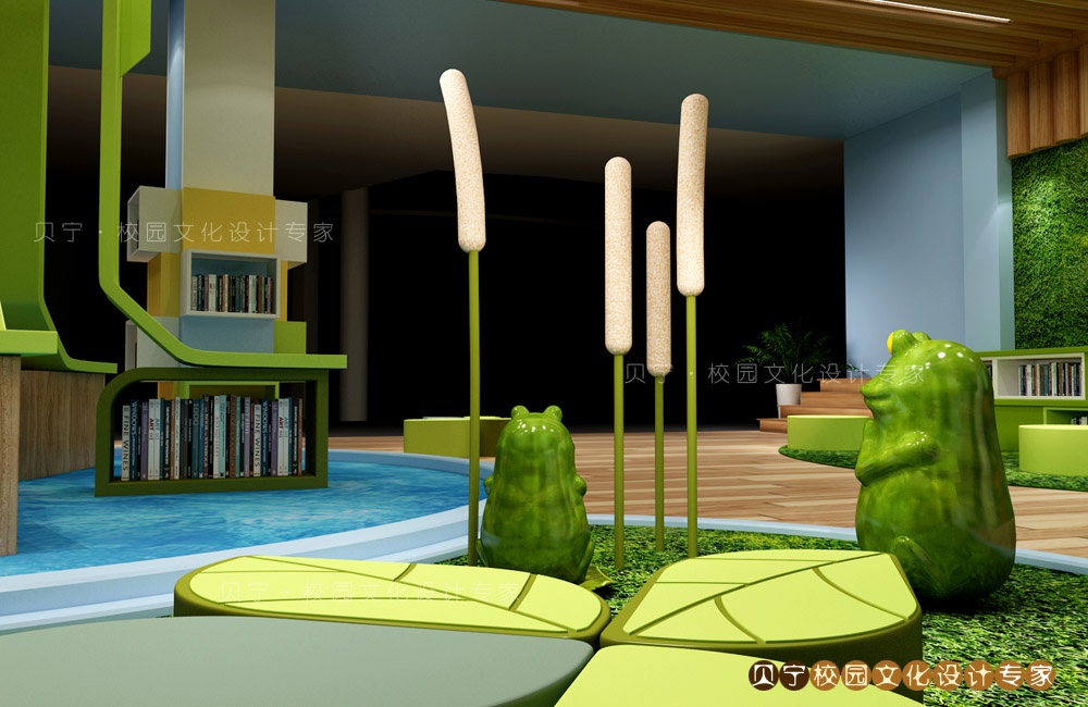 大树书架下的地面设计成池塘,营造出在青草水岸边,周围萦绕悦耳蛙声的惬意画面。