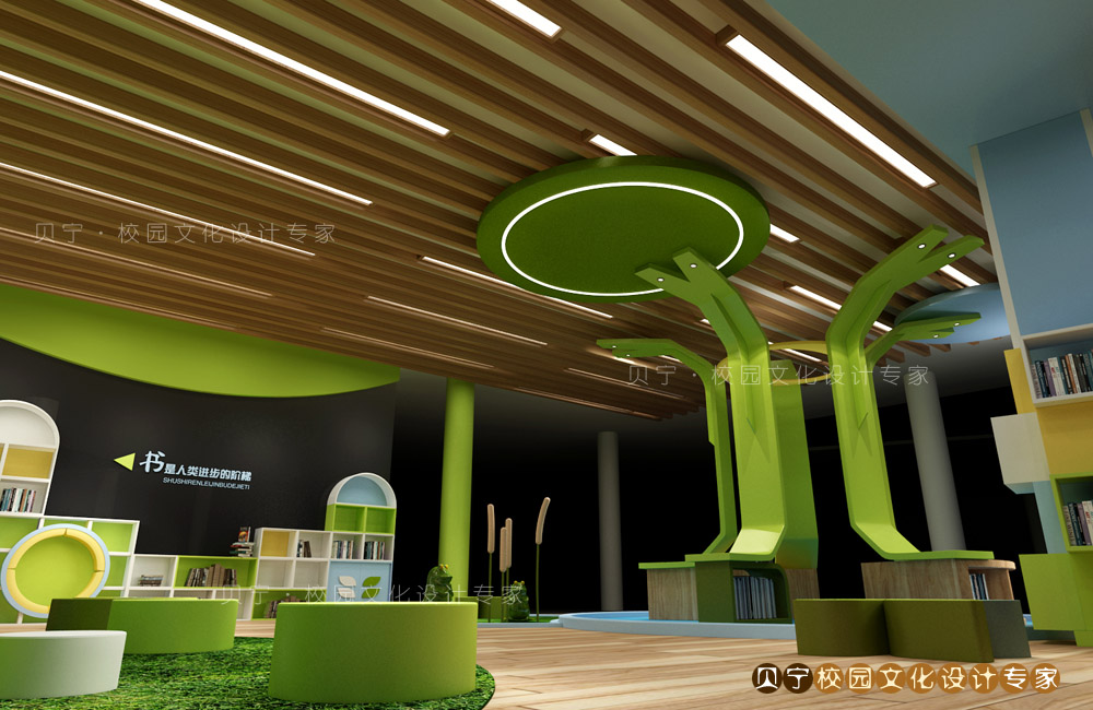 因此把大书架设计为树木造型,表达了学校如同大树一般,为孩子们遮风挡雨,带来依靠的意义。